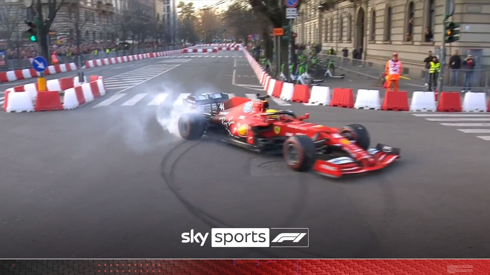 Charles Leclerc and Lewis Hamilton did donuts in the streets in Milan as part of a demo event for Ferrari.Original Article
