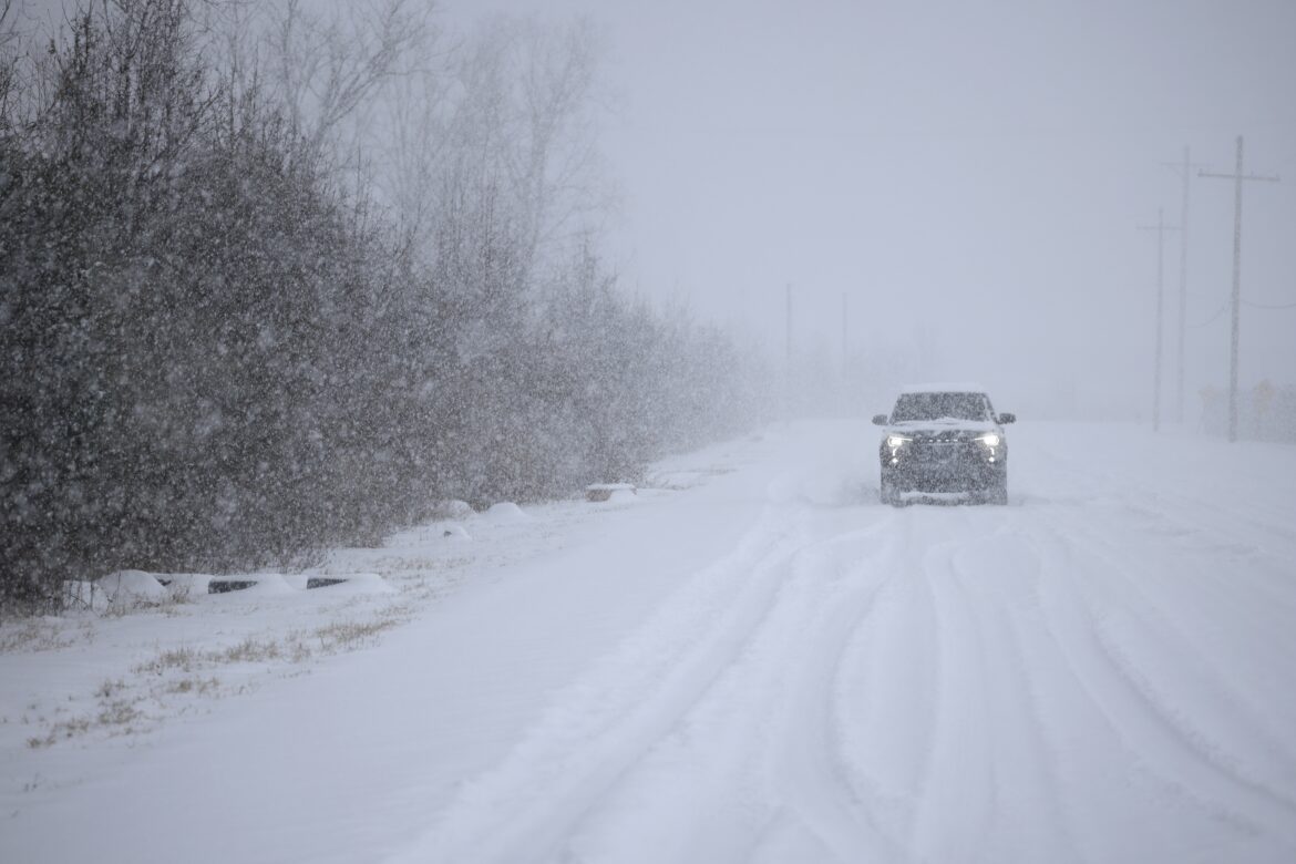A motorist drives through the snow near Louisville Muhammad Ali International Airport on Sunday in Louisville, Ky. Local forecasts called for heavy snowfall followed by significant accumulation of freezing rain and ice.